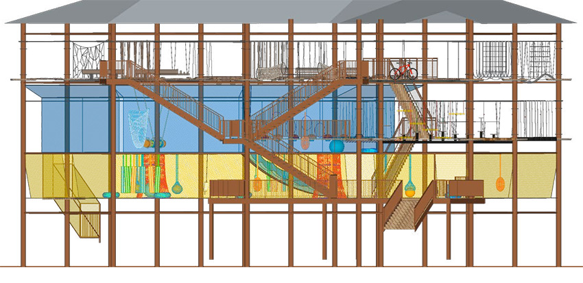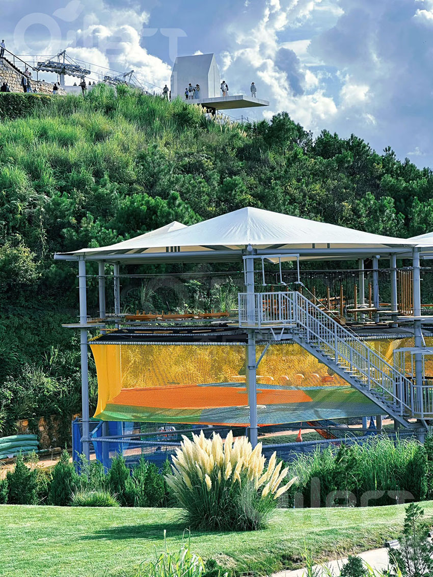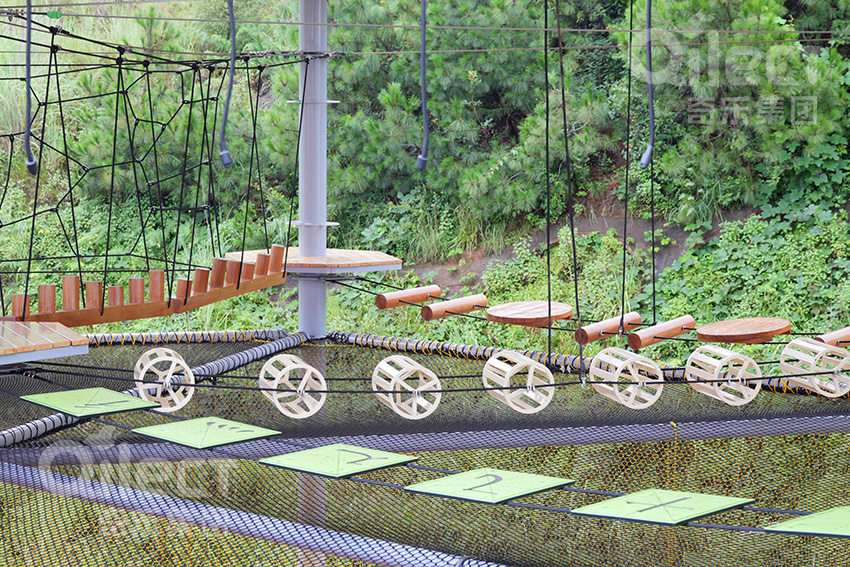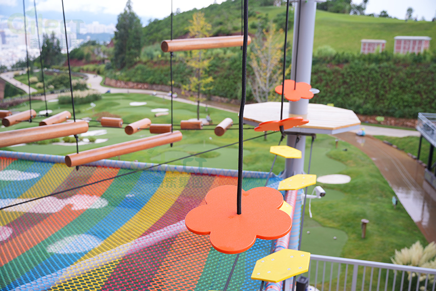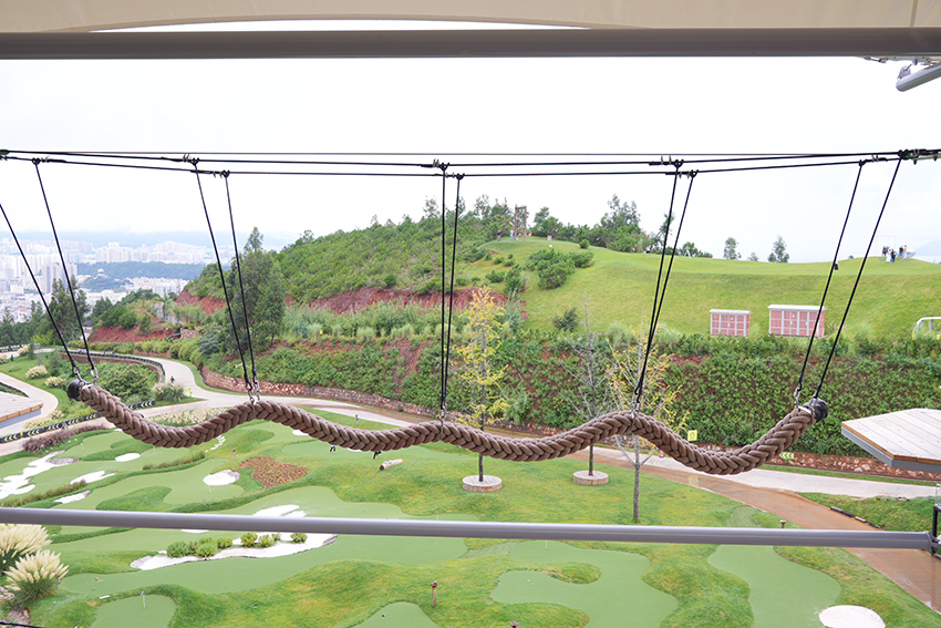 二層設計為一個繩網體驗層+16個拓展步道,輕極限體驗,挑戰難度適中,可以讓挑戰者更好的適應,先培養信心,以便完成更高一層的挑戰。