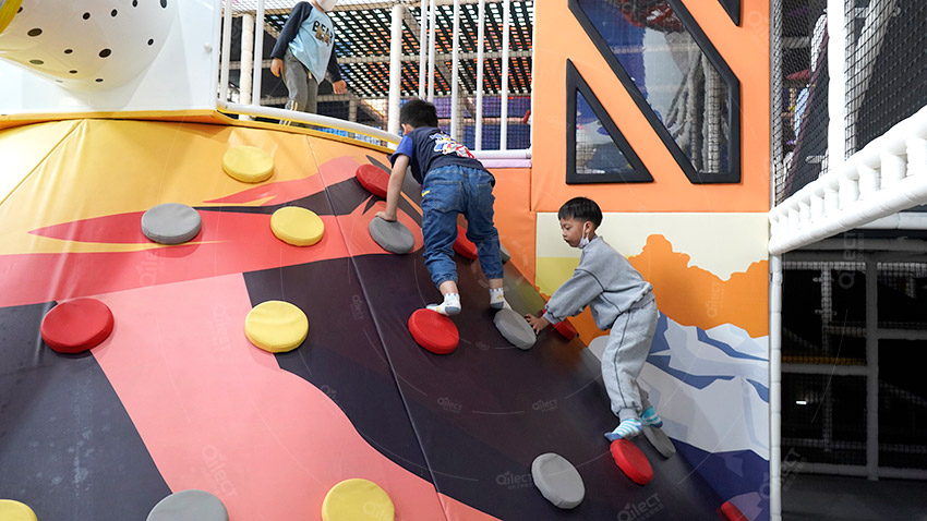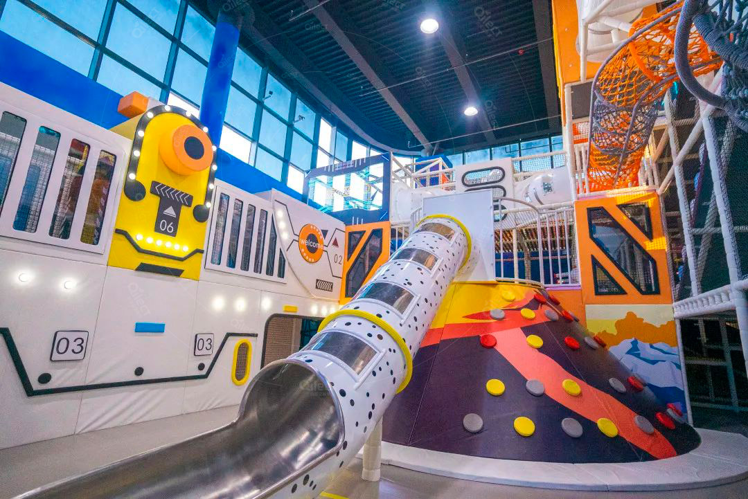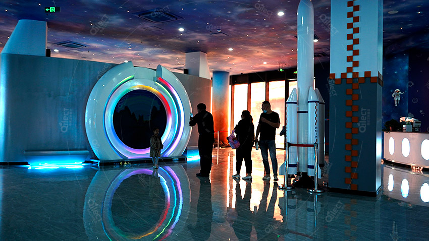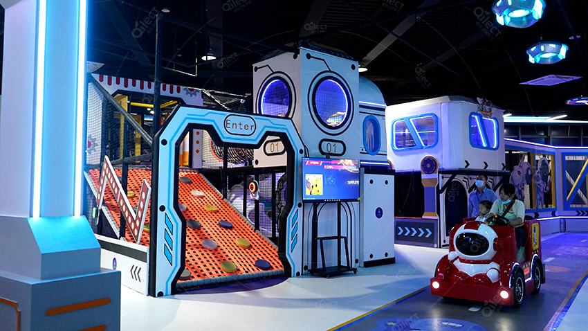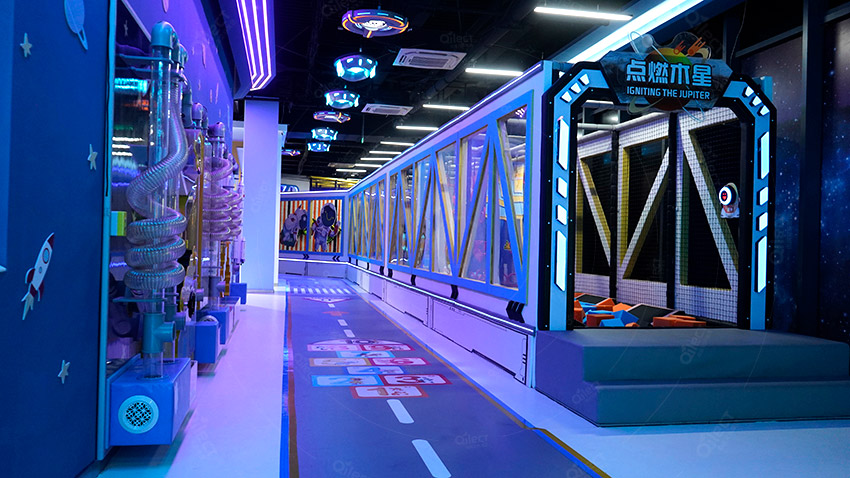 二層根據(jù)原有空間設(shè)計了接引站,火星基地,發(fā)射基地,駕駛基地,星際漂移,時空之門,兒童滑索,太空攀巖,太空基地,星際劇場,益智攀爬、點燃木星、角色體驗等項目,巧妙地設(shè)置闖關(guān)項目,可玩性更強。