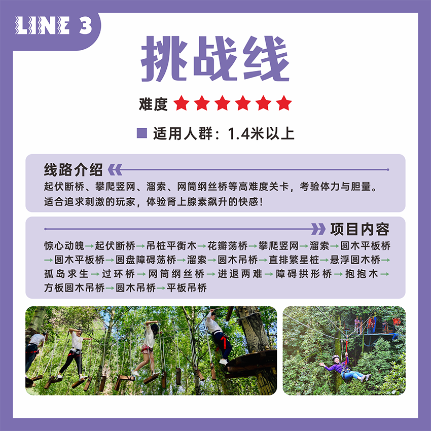 專為勇敢者準(zhǔn)備的進(jìn)階之路!挑戰(zhàn)線擁有更高的平臺(tái)、更長的滑索和更復(fù)雜的障礙組合,如連續(xù)高空吊樁、Z字形平衡木、溜索、進(jìn)退兩難等。每一步都在考驗(yàn)?zāi)愕捏w力、耐力和心理素質(zhì)。