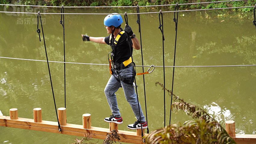 將叢林穿越與水元素結(jié)合!穿梭于樹冠之間,架設(shè)于田園水系之上,游客在水面上穿越,體驗(yàn)“水上輕功”的獨(dú)特樂趣。