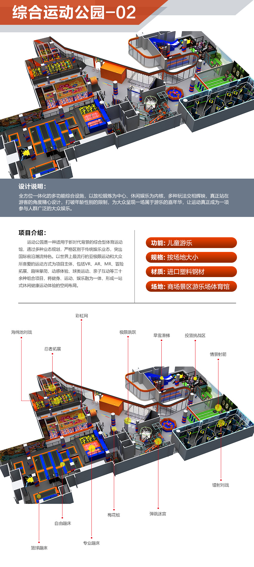 本項目適用于各種親子主題類的樂園,巧妙運用“熊貓”IP造型設計,集拓展、探險、滑道、飛索、蹦極、不銹鋼滑梯、攀巖、爬網等46種不同運動體驗的文化主題項目,結合“大灰熊”IP形象,融入相關設計元素,打造差異化的網紅IP主題性運動拓展營地綜合體。 在裝飾設計上采用竹葉和竹竿的綠色設計元素,以原生態(tài)、自然風格為基調,采用原木、繩網和不銹鋼等柔韌度好的生態(tài)材料。滿足大眾貼近自然、主題鮮明、寓教于樂的兒童素質訓練教育親子樂園的精神訴求。