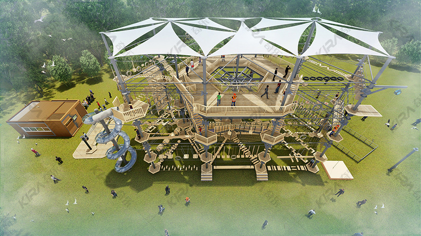 以晶體結(jié)構(gòu)搭建架空層2-4個(gè)步道層級(jí),打造層超過650米長(zhǎng)的空中游樂路線,其中包含91個(gè)運(yùn)動(dòng)項(xiàng)目(包括尖叫滑梯、矩形秋千、低空蹦極、戶外攀巖等4個(gè))