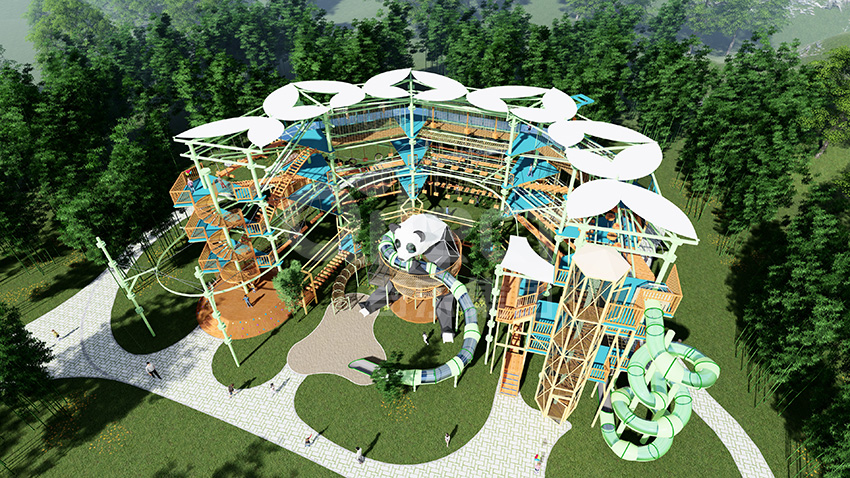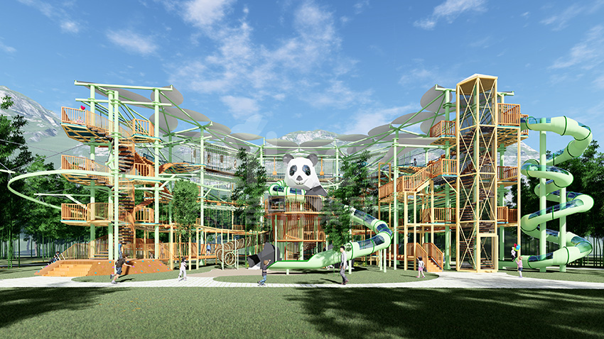 本項目適用于各種親子主題類的樂園,巧妙運用“熊貓”IP造型設計,集拓展、探險、滑道、飛索、蹦極、不銹鋼滑梯、攀巖、爬網等46種不同運動體驗的文化主題項目,結合“大灰熊”IP形象,融入相關設計元素,打造差異化的網紅IP主題性運動拓展營地綜合體。 在裝飾設計上采用竹葉和竹竿的綠色設計元素,以原生態、自然風格為基調,采用原木、繩網和不銹鋼等柔韌度好的生態材料。滿足大眾貼近自然、主題鮮明、寓教于樂的兒童素質訓練教育親子樂園的精神訴求。
